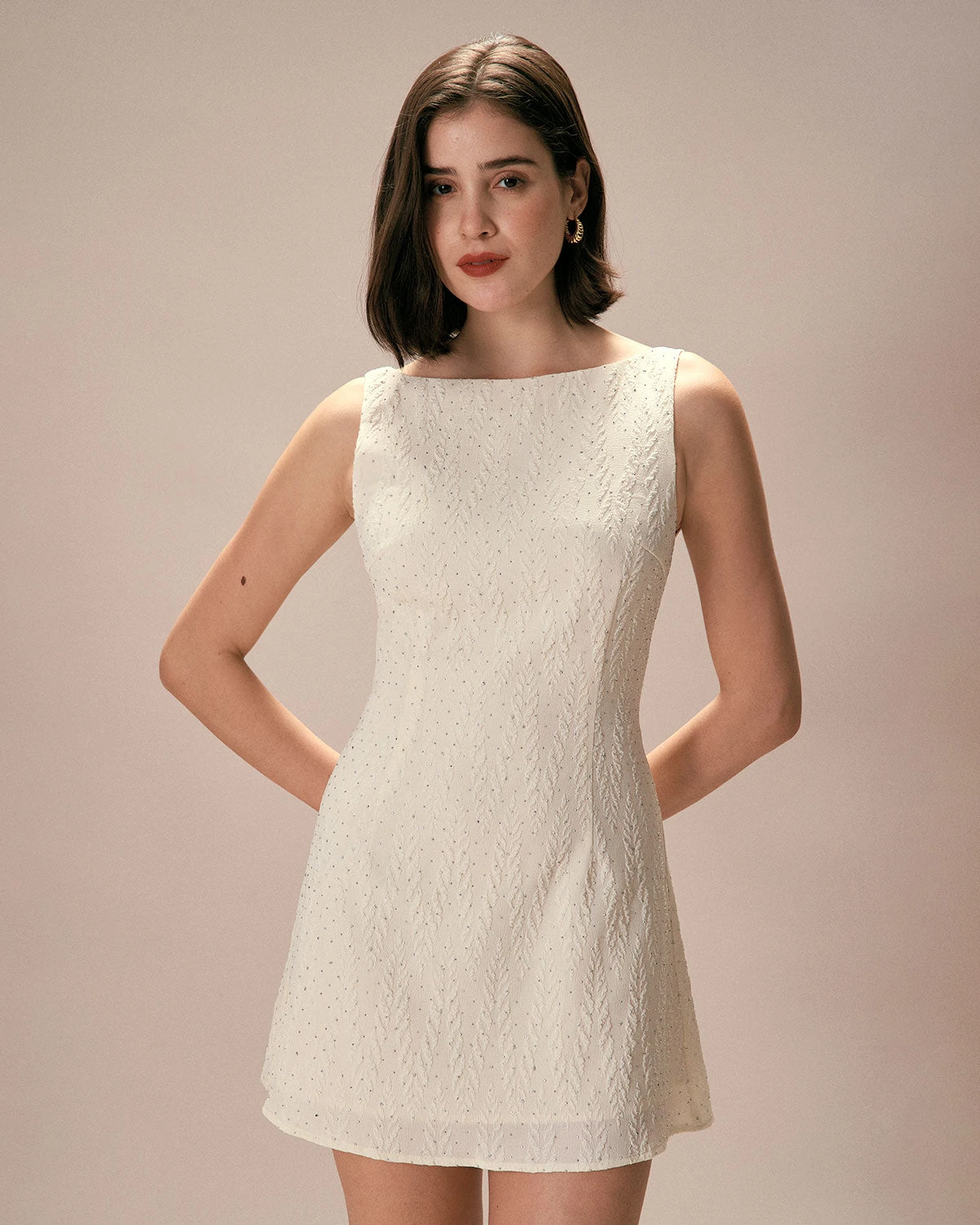 Crafted with meticulous attention to detail, this sleeveless mini dress features a flattering boat neckline that accentuates the collarbone and shoulders, creating a graceful silhouette. The textured fabric adds a touch of luxury, elevating the overall look of the dress. Its mini-length offers a modern twist, making it perfect for both casual outings and special occasions.