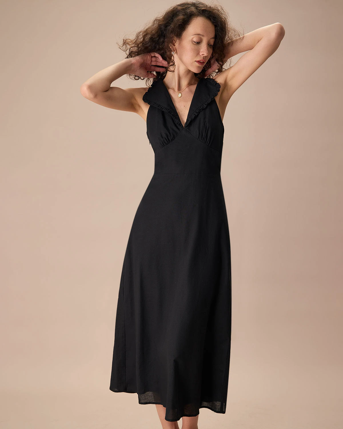 Crafted from breathable linen, this dress ensures comfort while exuding elegance. Its classic black hue is complemented by a stylish collar and delicate frill trim, adding a touch of femininity and refinement. The maxi length provides a graceful silhouette, ideal for both daytime events and evening gatherings.