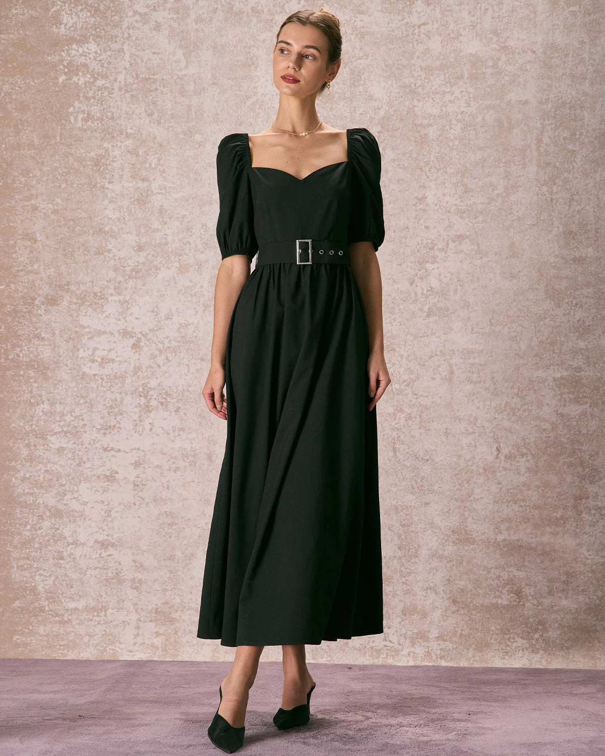 The sweetheart neckline adds a touch of romance, framing the décolletage beautifully, while the puff sleeves add a whimsical touch, bringing a modern twist to the classic silhouette. Made from luxurious fabric, this short sleeve dress drapes effortlessly, offering both comfort and sophistication. The cinched waist with a belt detail accentuates your curves, creating a flattering hourglass shape. The flowing maxi length adds drama and grace, making it perfect for formal events or glamorous evenings out.