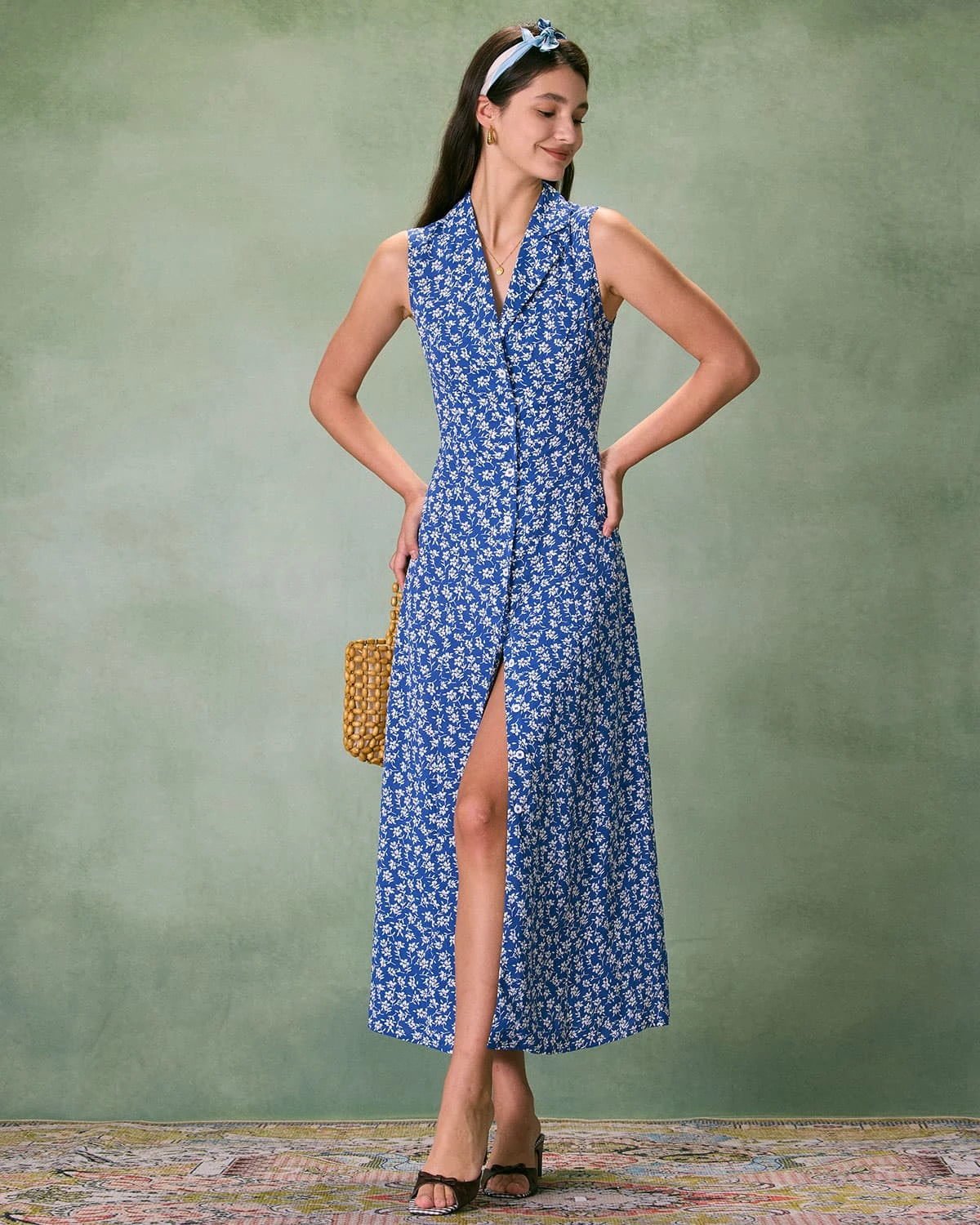 Crafted from a luxurious blend of soft, breathable fabrics, this floral maxi dress offers unparalleled comfort from day to night. The collared neckline adds a touch of refinement, while the button-up front allows for easy wear and a customizable fit.