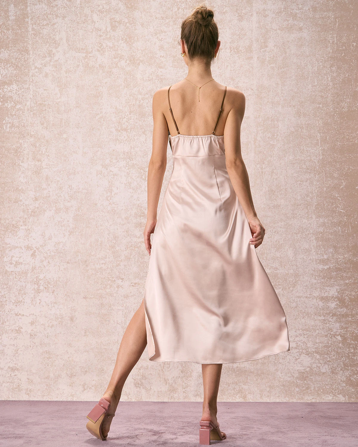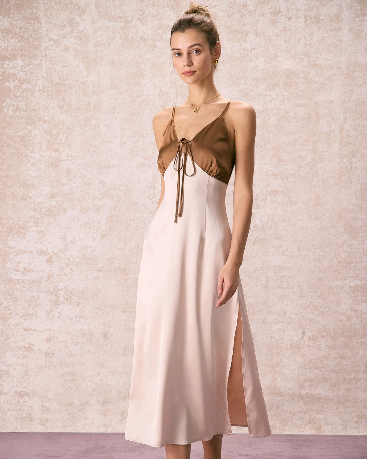 The V-neckline adds a touch of allure, beautifully complemented by the colorblock design that creates a striking visual impact. Made from luxurious satin fabric, this satin midi dress drapes gracefully, offering both comfort and sophistication. In a sophisticated khaki hue, this dress exudes understated glamour, making it perfect for a variety of occasions, from cocktail parties to formal events. The midi length adds a sense of refinement, while the colorblock detailing adds a contemporary edge, ensuring you stand out from the crowd.