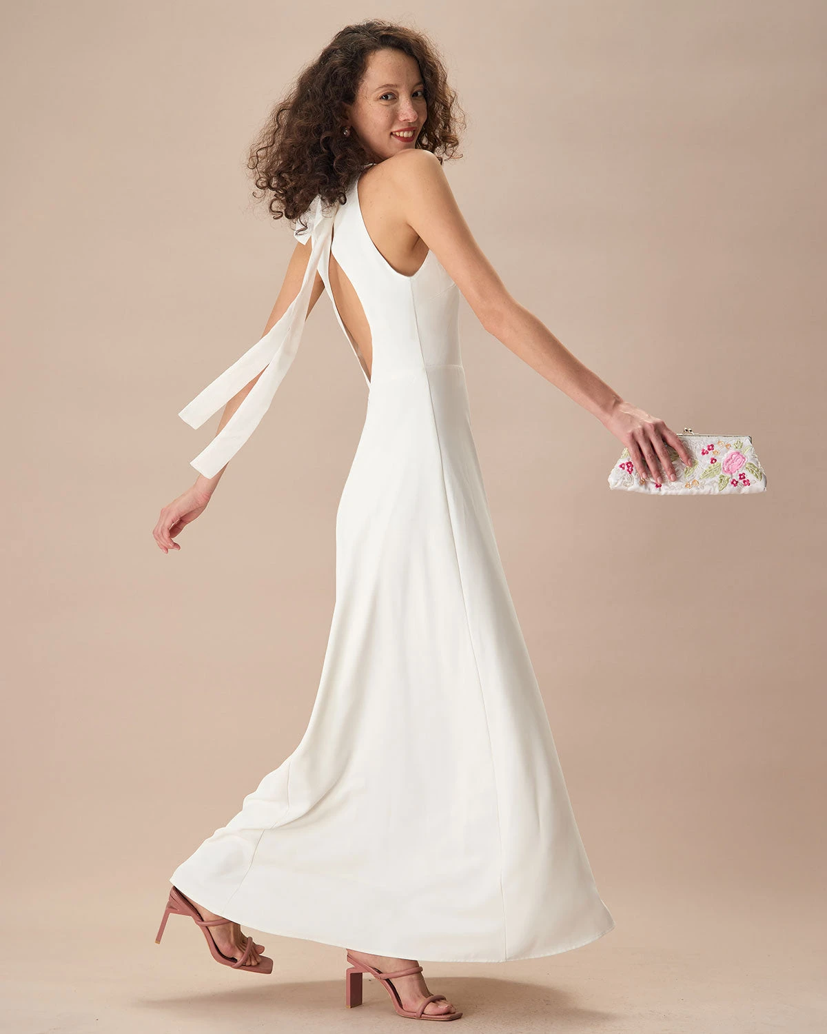 this dress features a flattering halter neckline adorned with a delicate bowknot, adding a touch of whimsical charm. The flowing maxi-length skirt creates a graceful and elongated silhouette, perfect for both casual and formal occasions.