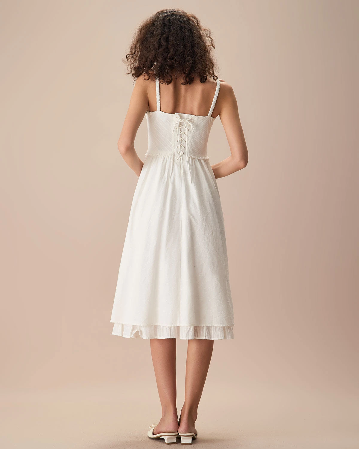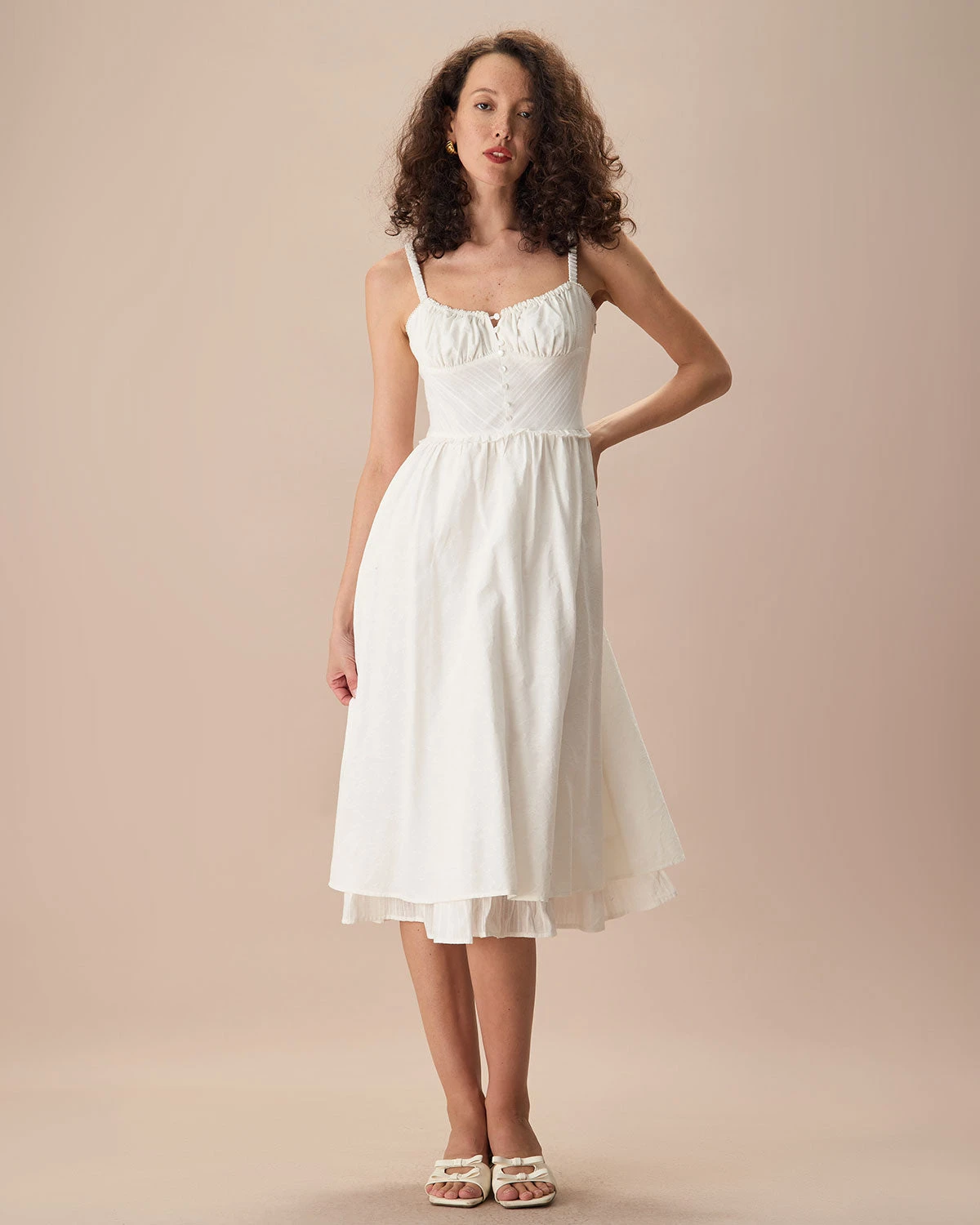 Crafted from soft, breathable cotton, this midi dress features a sleek slip design with delicate ruching that enhances the silhouette and adds a touch of sophistication. The pristine white fabric offers a timeless and versatile look, making it ideal for both casual and semi-formal occasions.