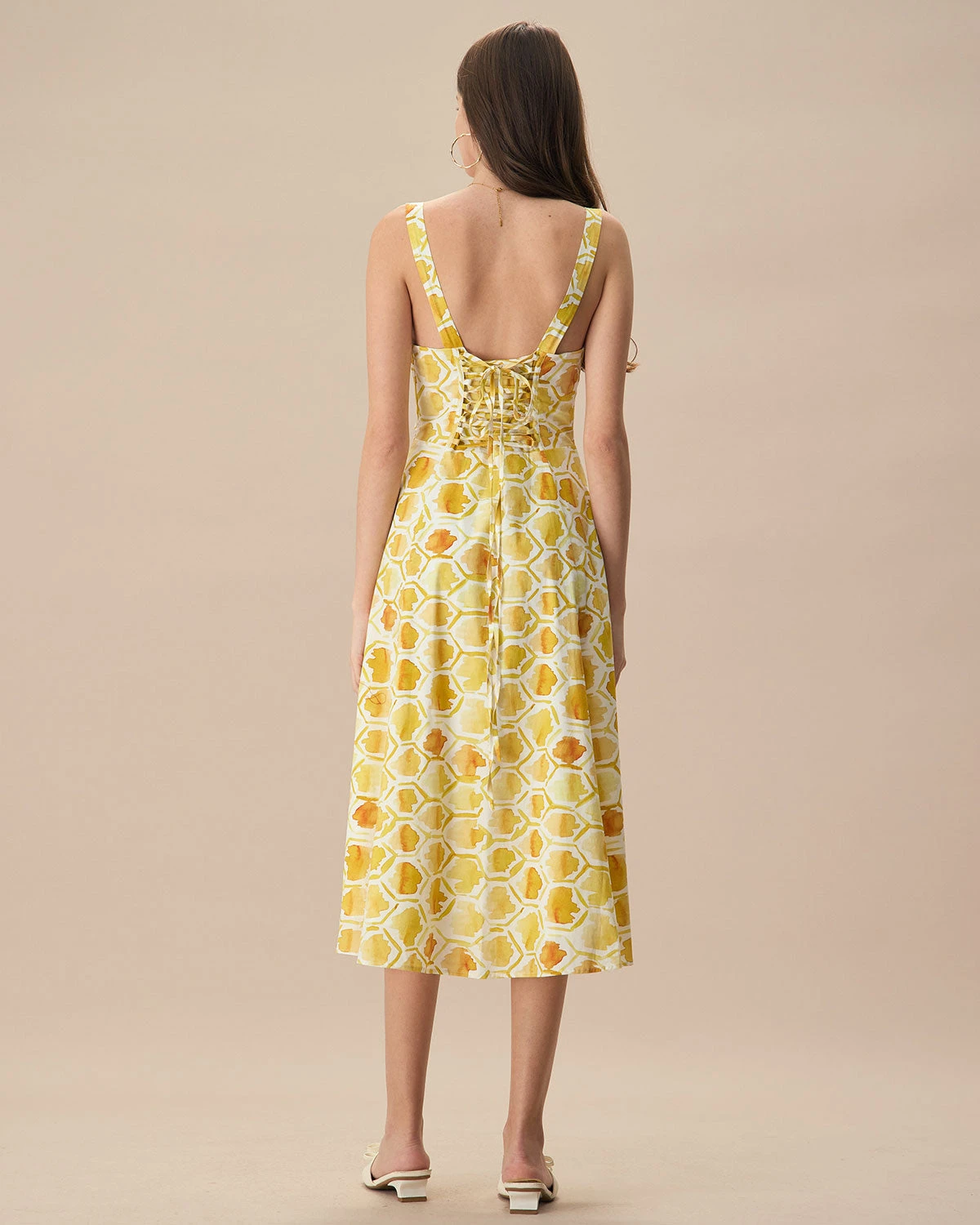 This dress features a flattering square neckline and a slip-style silhouette that drapes beautifully over the body, ensuring both comfort and style. The vibrant yellow fabric is adorned with a delicate floral print, adding a touch of femininity and freshness.